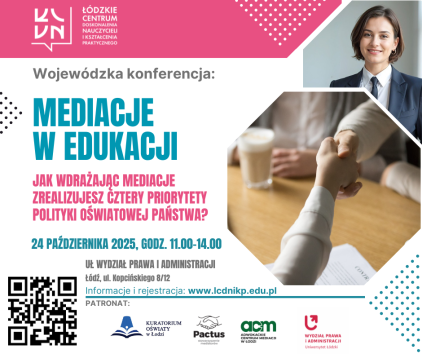 W imieniu Łódzkiego Centrum Doskonalenia Nauczycieli i Kadr Pedagogicznych zapraszamy na Wojewódzką konferencję pod patronatem Łódzkiego Kuratora Oświaty z udziałem przedstawicieli ORE: Mediacje w edukacji. Jak wdrażając mediacje zrealizujesz cztery priorytety polityki oświatowej państwa?